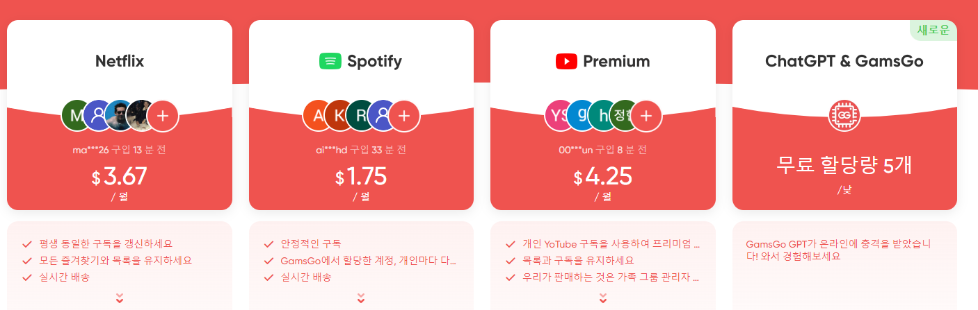 겜스고는 OTT 서비스인 넷플릭스, 유튜브 프리미엄, 디즈니 플러스 등을 월 4,000원 미만의 비용으로 이용할 수 있는 방법을 제공합니다.
