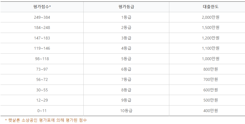 - 최고 2천만원 한도 내에서 '햇살론 소상공인 평가표'에 의해 평가된 점수별 평가등급에 따라 대출한도가 달라집니다.