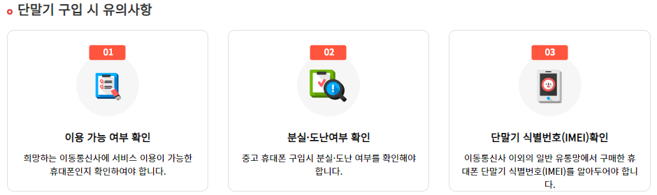 희망하는 이동통신사에 서비스 이용이 가능한 폰인지 확인을 하여야 하며 중고 휴대폰 구입 시에는 분실이나 도난 여부를 확인해야 하며 식별번호인 IMEI도 알아 두어야 합니다.
