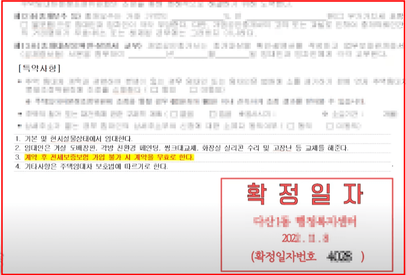 하지만 최근에는 보증보험을 받을 수 없는 건축물인데도 거짓으로 속여서 허위 계약하는 경우가 많기 때문에 전세 계약하기 전에 꼭 특약에 '계약 후 전세 보증보험 가입 불가시 계약을 무효로 한다.' 이런 내용을 요구하는 것도 내 보증금을 지키는 좋은 방법입니다.