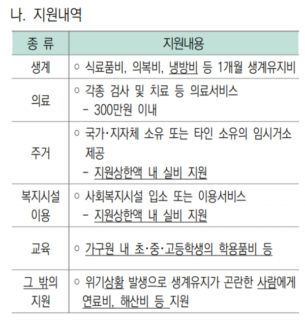 지원내역은 생계, 의료, 주거, 복지시설이용, 교육, 연료비, 해산비로 분류되며 지원금액은 참고해 주시기 바랍니다.