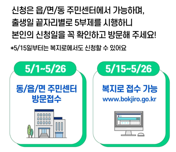 읍면동 주민센터 신청 : '23.5.1.(월)~'23.5.26.(금) - 신청시작 2주간(5.1~5.12) 출생일 기준 5부제를 적용합니다.