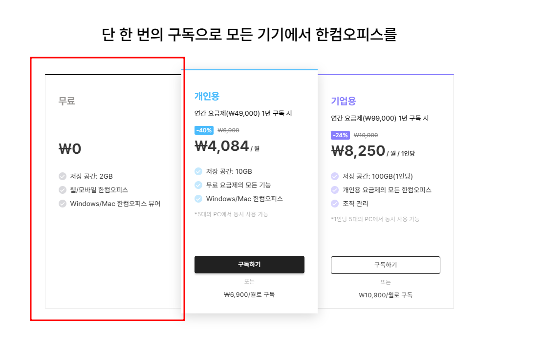 제공하는 저장 용량의 경우 2GB를 무료로 제공(그 이상 용량을 선택 시에는 유료결제를 해야 하니 참고하세요.) 하고 있습니다. 네이버 클라우드 용량이 부족하다면 한컴 스페이스 용량을 활용할 수 있습니다.